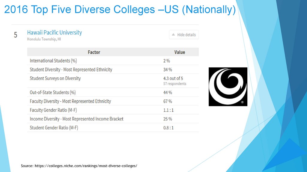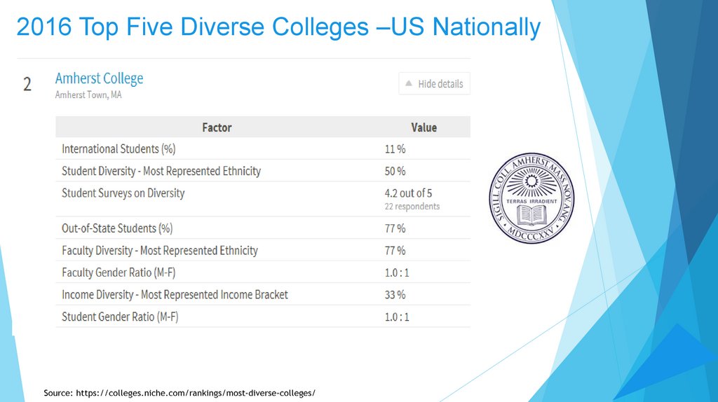2016 Top Five Diverse Colleges –US (Nationally)Source: https://colleges.niche.com/rankings/most-diverse-colleges/