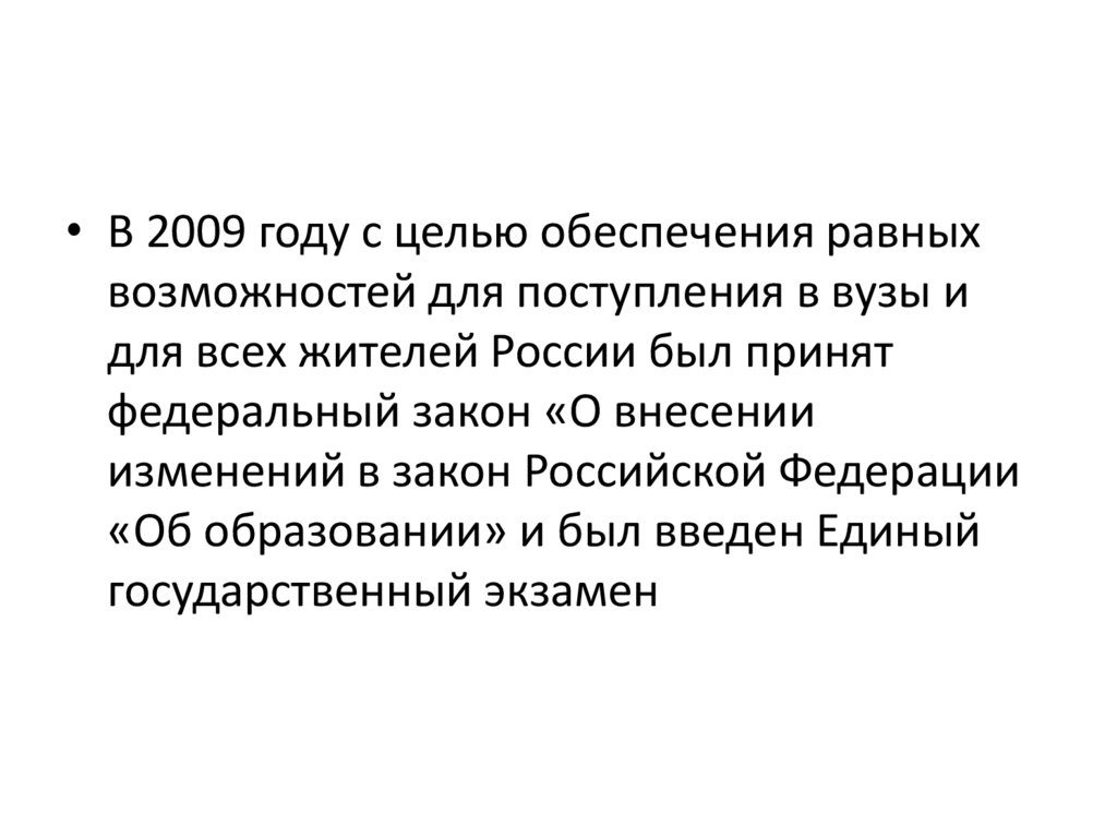 • В 2009 году с целью обеспечения равныхвозможностей для поступления в вузы и