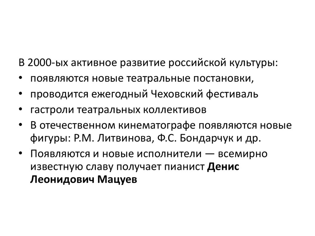 В 2000-ых активное развитие российской культуры:• появляются новые театральные постановки,