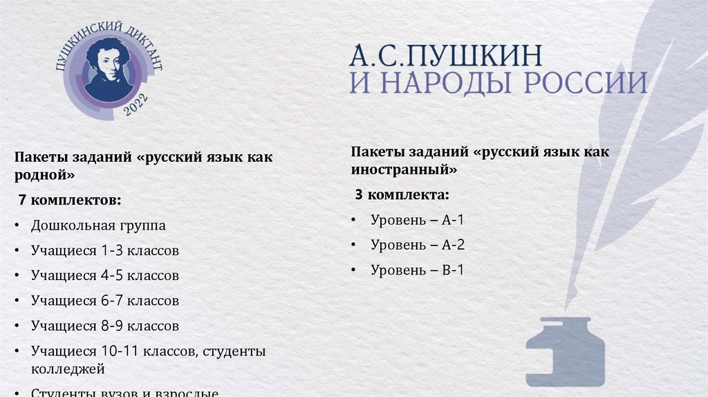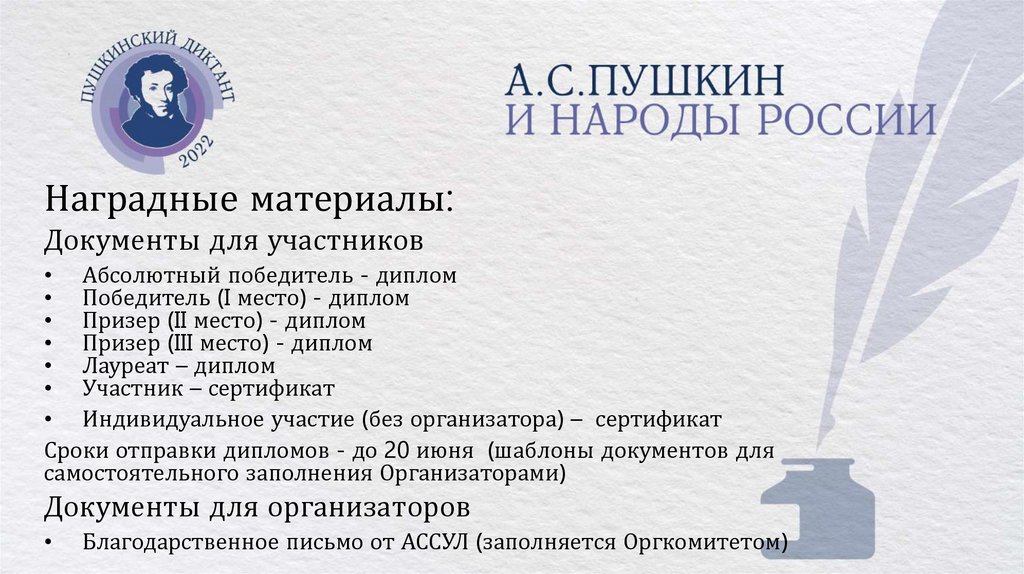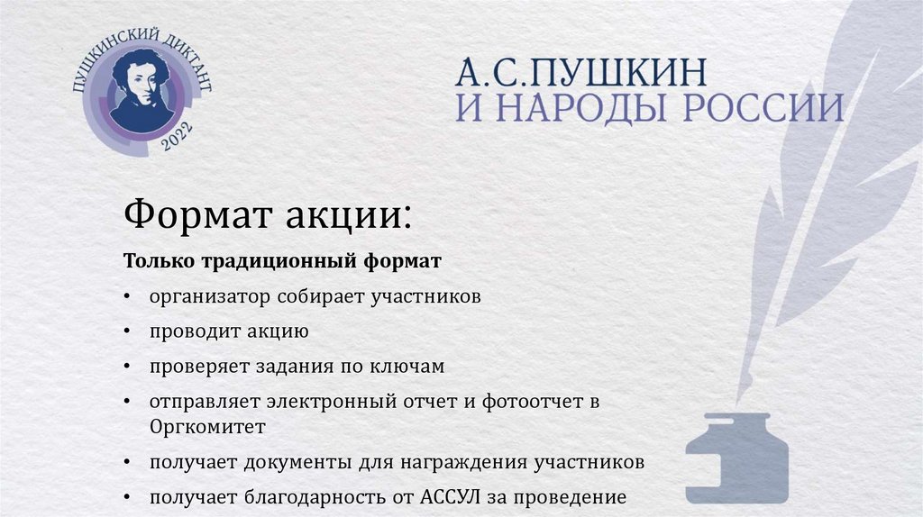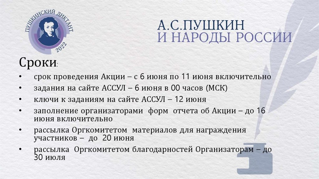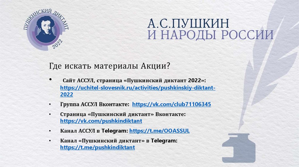 Где искать материалы Акции?Сайт АССУЛ, страница «Пушкинский диктант 2022»: