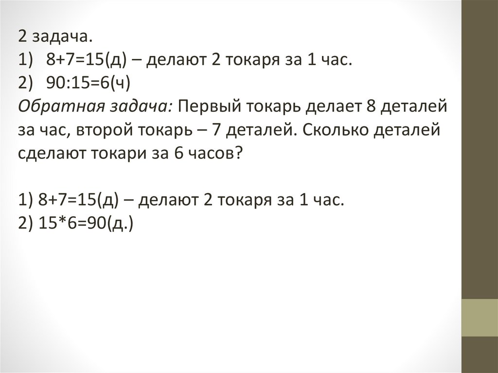 2 задача.1) 8+7=15(д) – делают 2 токаря за 1 час.