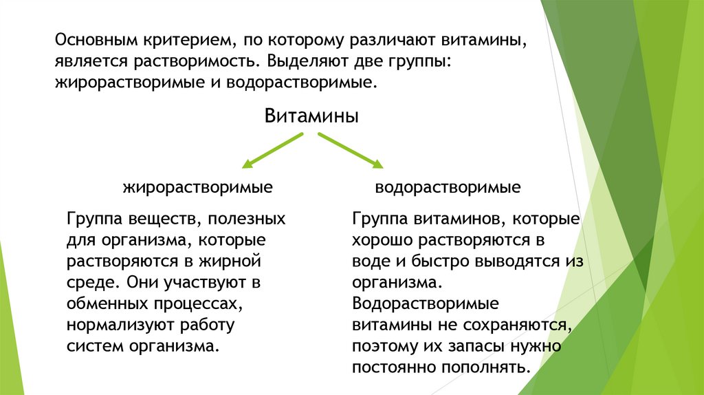 Основным критерием, по которому различают витамины,является растворимость. Выделяют две группы: