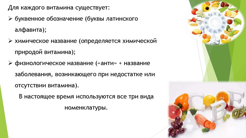 Для каждого витамина существует:буквенное обозначение (буквы латинского