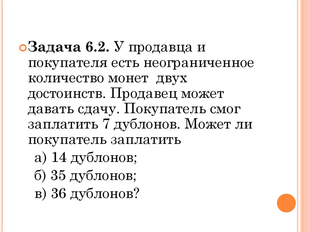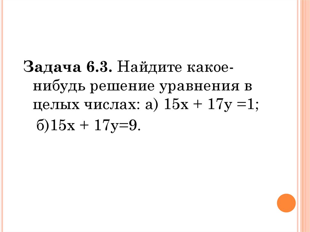 Задача 6.3. Найдите какоенибудь решение уравнения вцелых числах: а) 15x + 17y =1;
