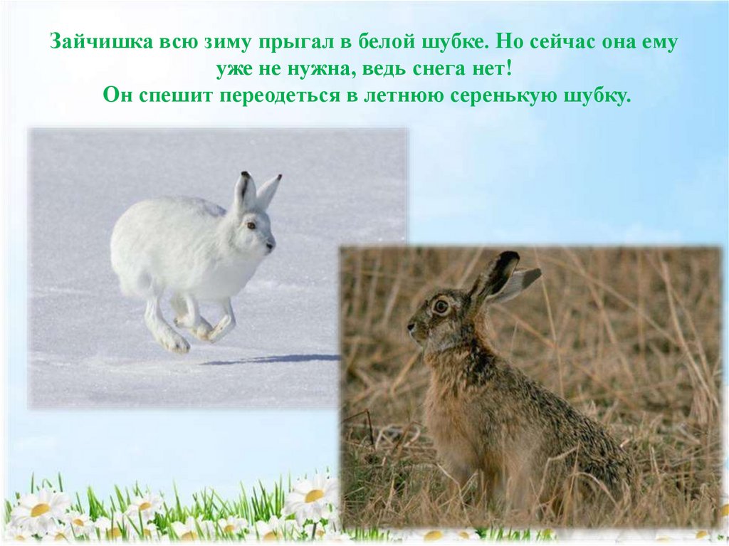 1. Зайчишка всю зиму прыгал в белой шубке. Но сейчас она ему уже не нужна, ведь снега нет! Он спешит переодеться в летнюю