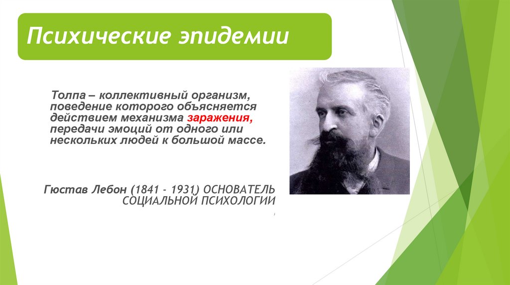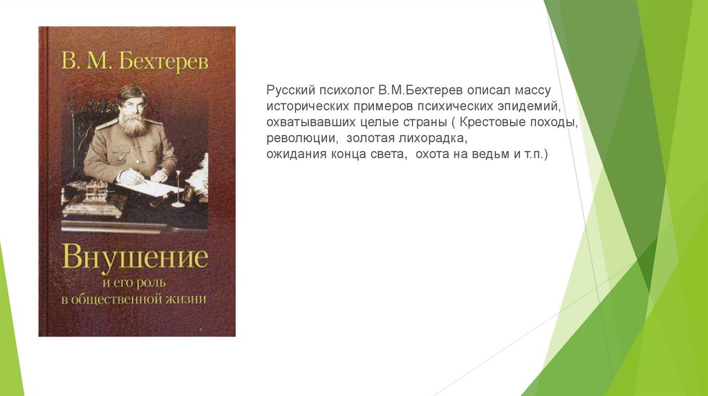Русский психолог В.М.Бехтерев описал массуисторических примеров психических эпидемий,
