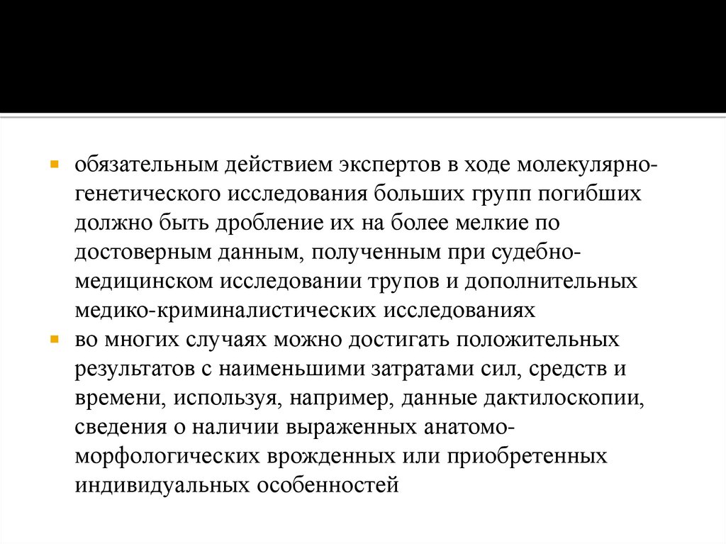 обязательным действием экспертов в ходе молекулярногенетического исследования больших групп погибшихдолжно быть дробление их на более мелкие по