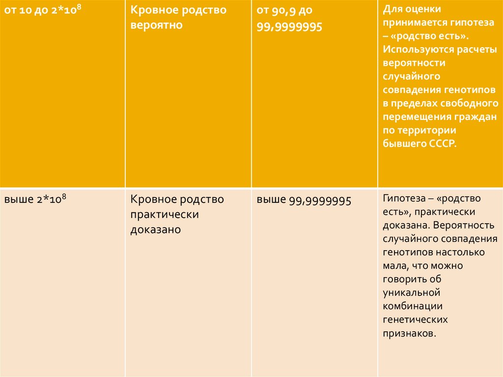 Шкала оценки значений коэффициента правдоподобия и процентавероятности кровного родства согласно Evett I.W., Weir B.S.