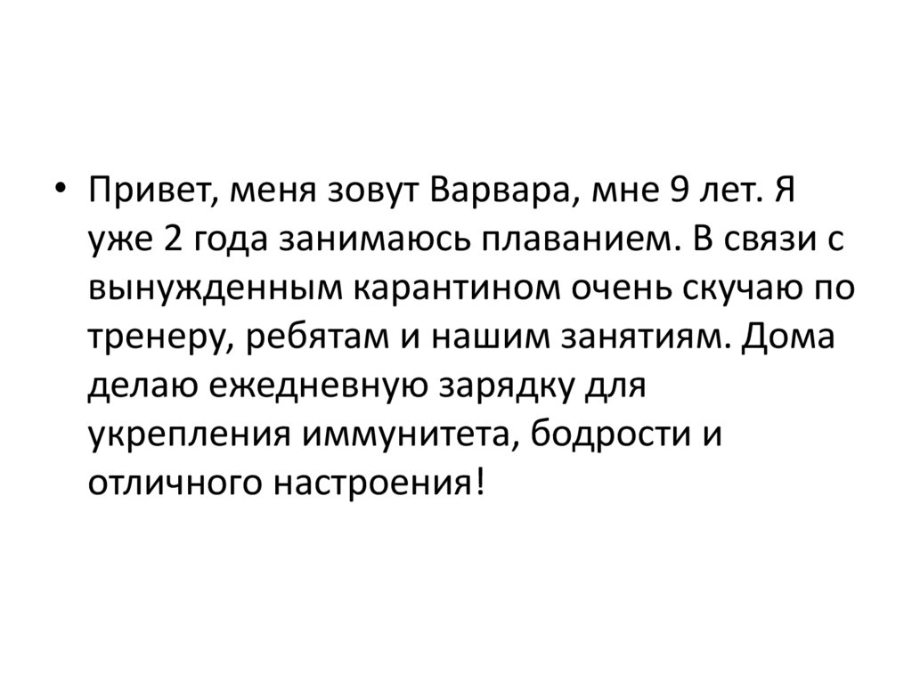 • Привет, меня зовут Варвара, мне 9 лет. Яуже 2 года занимаюсь плаванием. В связи с