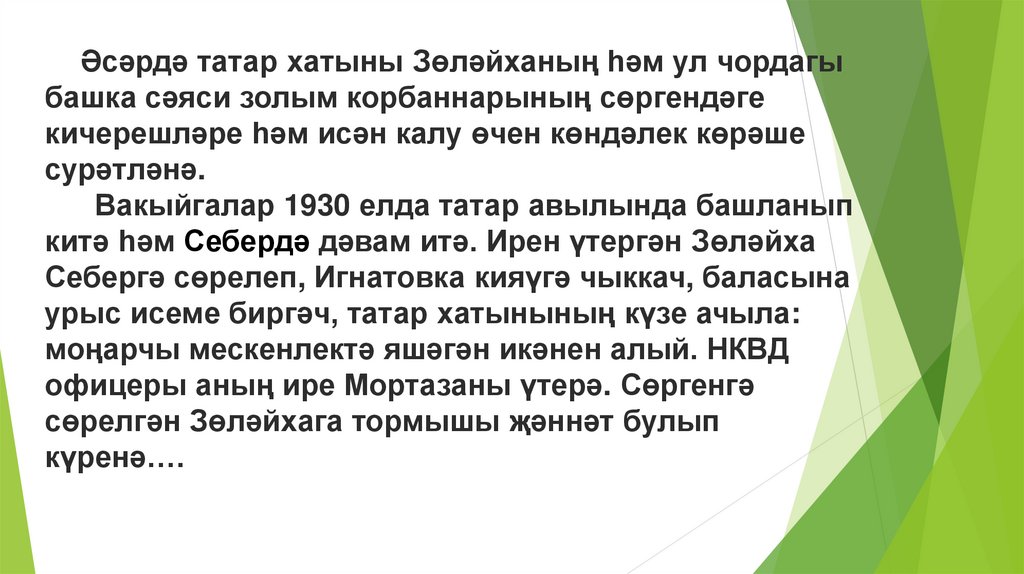 Әсәрдә татар хатыны Зөләйханың һәм ул чордагыбашка сәяси золым корбаннарының сөргендәге