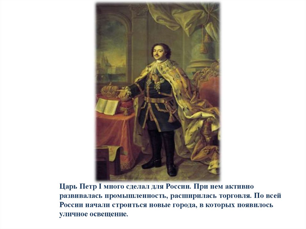 Царь Петр I много сделал для России. При нем активноразвивалась промышленность, расширилась торговля. По всей