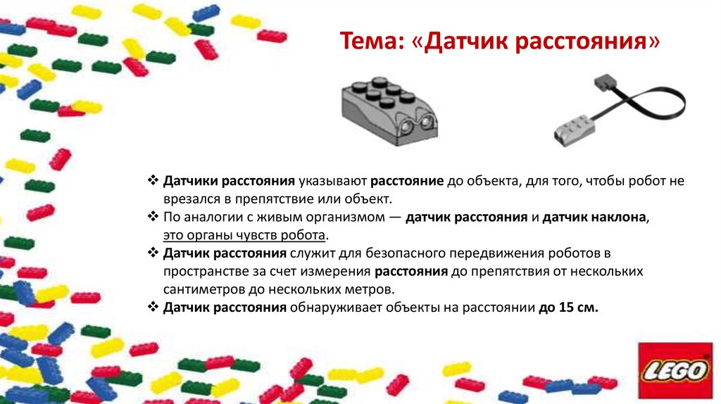 Тема: «Датчик расстояния»Датчики расстояния указывают расстояние до объекта, для того, чтобы робот не