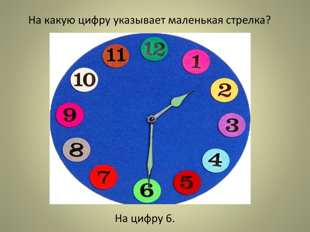 На какую цифру указывает маленькая стрелка?На цифру 6.