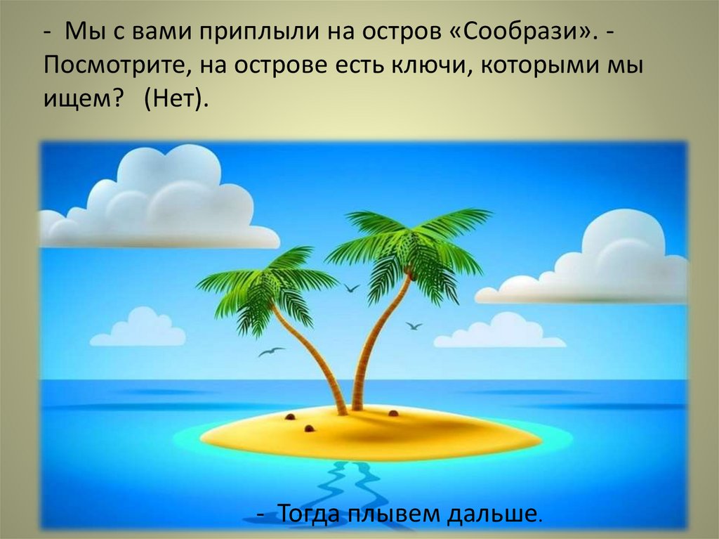 - Мы с вами приплыли на остров «Сообрази». Посмотрите, на острове есть ключи, которыми мыищем? (Нет).