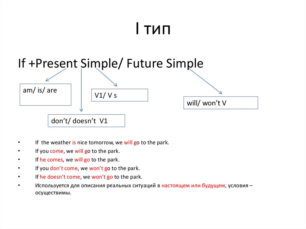 If he came, we would go to the park (Если бы он пришел, мы бы пошли в парк)