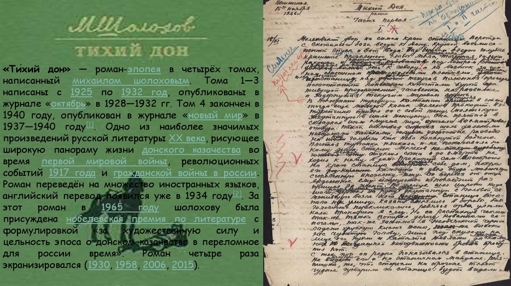 «Ти́хий дон» — роман-эпопея в четырёх томах,написанный михаилом шолоховым. Тома 1—3