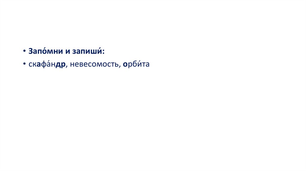 • Запо́мни и запиши́:• скафа́ндр, невесомость, орби́ та