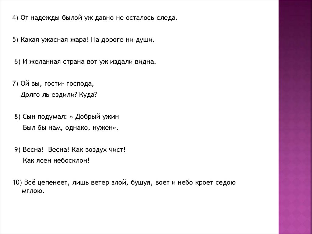 4) От надежды былой уж давно не осталось следа.5) Какая ужасная жара! На дороге ни души.