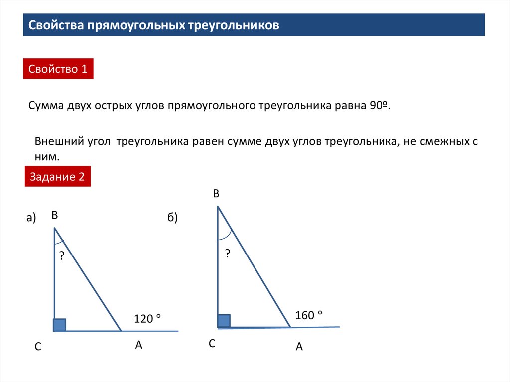 Свойства прямоугольных треугольниковСвойство 1