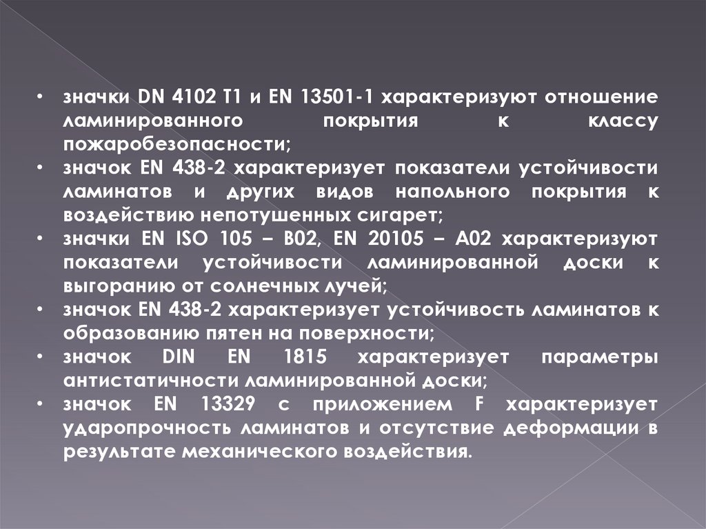 • значки DN 4102 T1 и EN 13501-1 характеризуют отношениеламинированного
