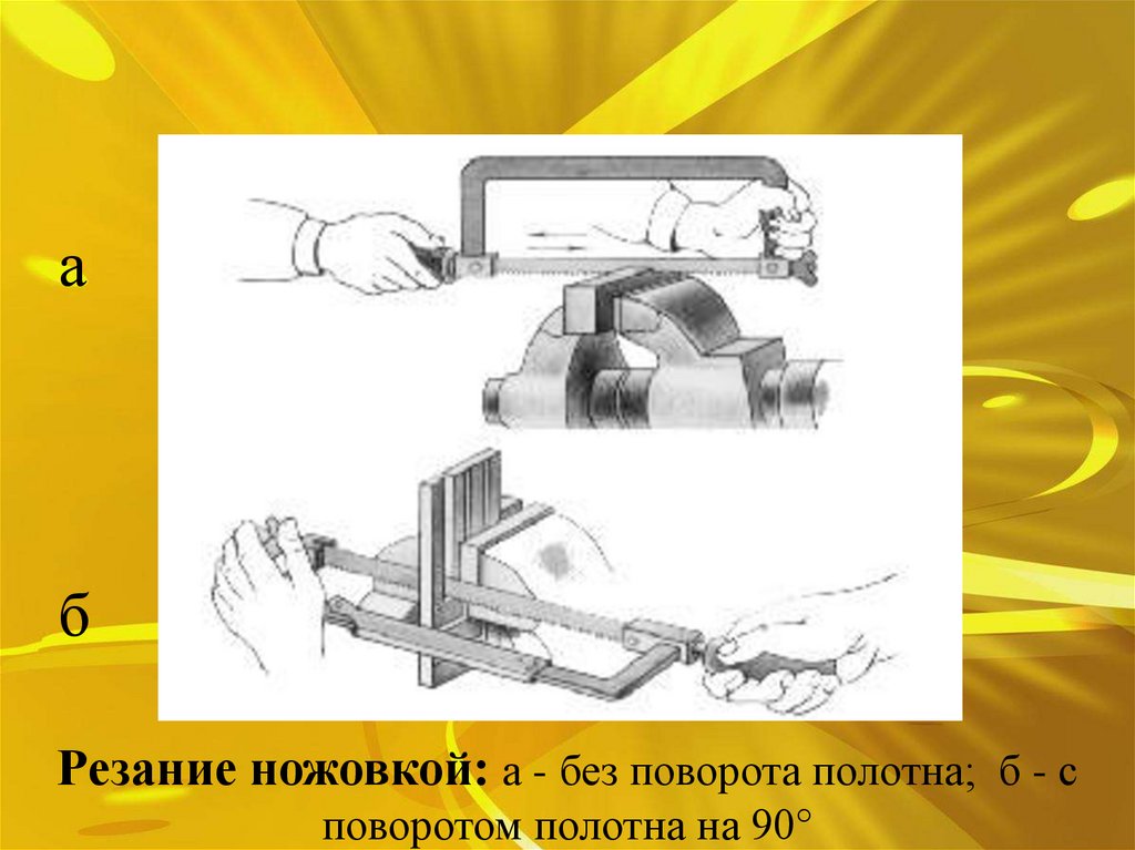 Резание ножовкой: а - без поворота полотна; б - с