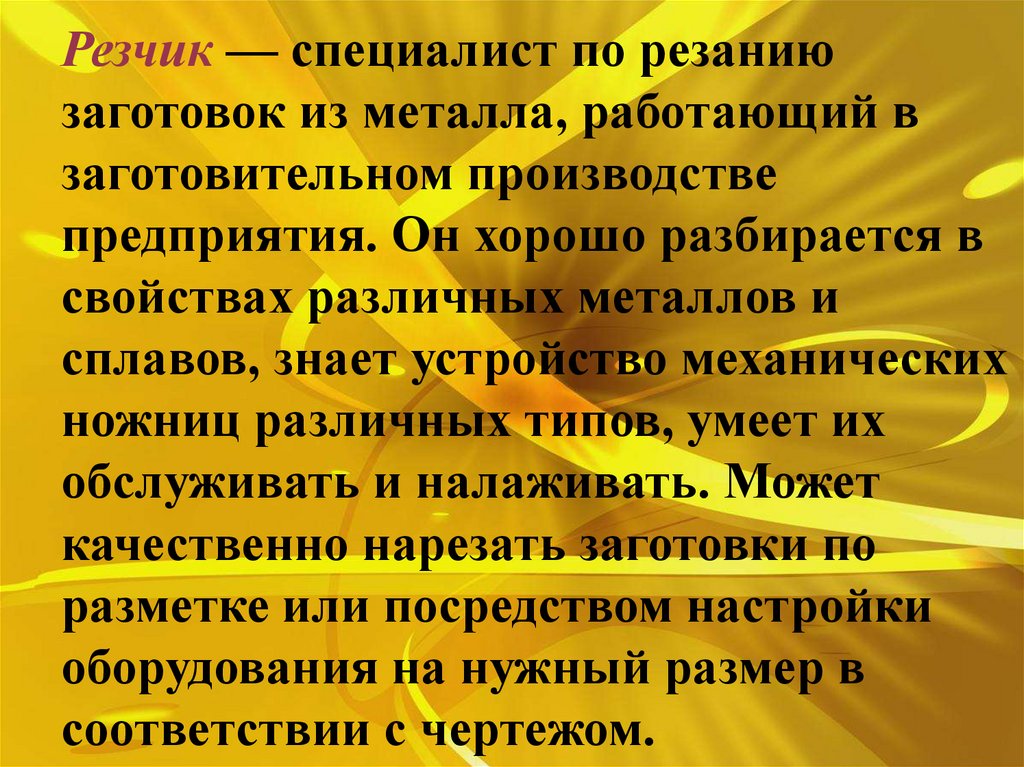 Резчик — специалист по резаниюзаготовок из металла, работающий в