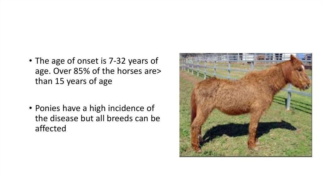 • The age of onset is 7-32 years ofage. Over 85% of the horses are>
