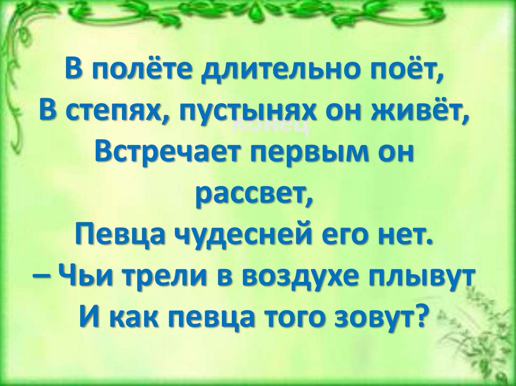 В полёте длительно поёт,В степях, пустынях он живёт,