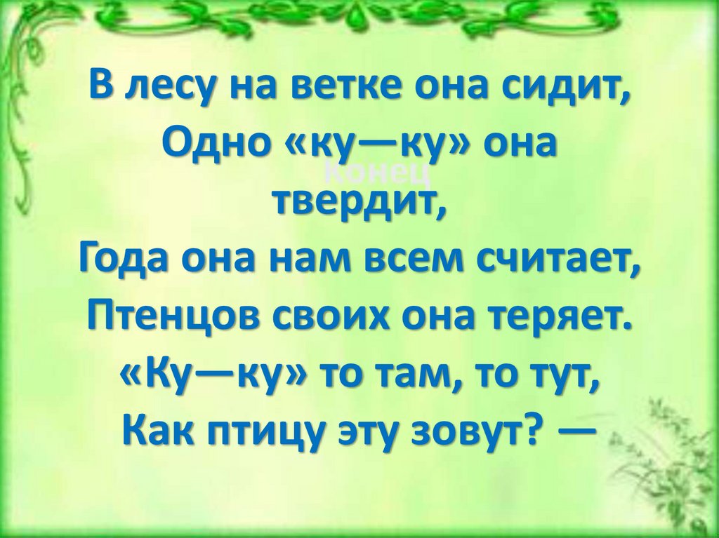 В лесу на ветке она сидит,Одно «ку—ку» она