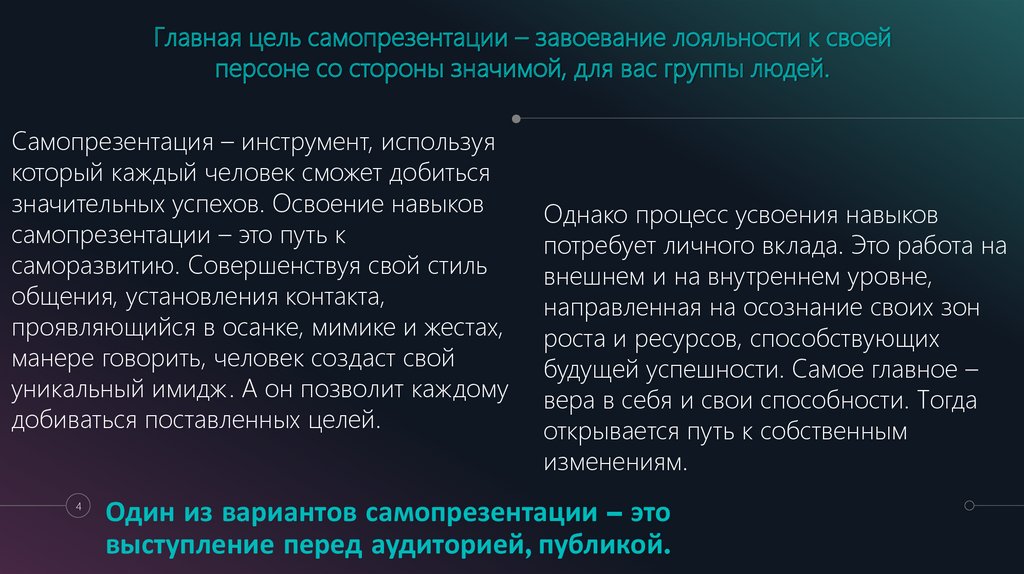 Главная цель самопрезентации – завоевание лояльности к своейперсоне со стороны значимой, для вас группы людей.