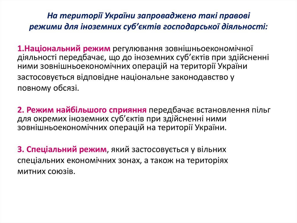 На території України запроваджено такі правовірежими для іноземних суб’єктів господарської діяльності: