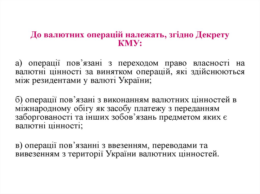 До валютних операцій належать, згідно ДекретуКМУ: