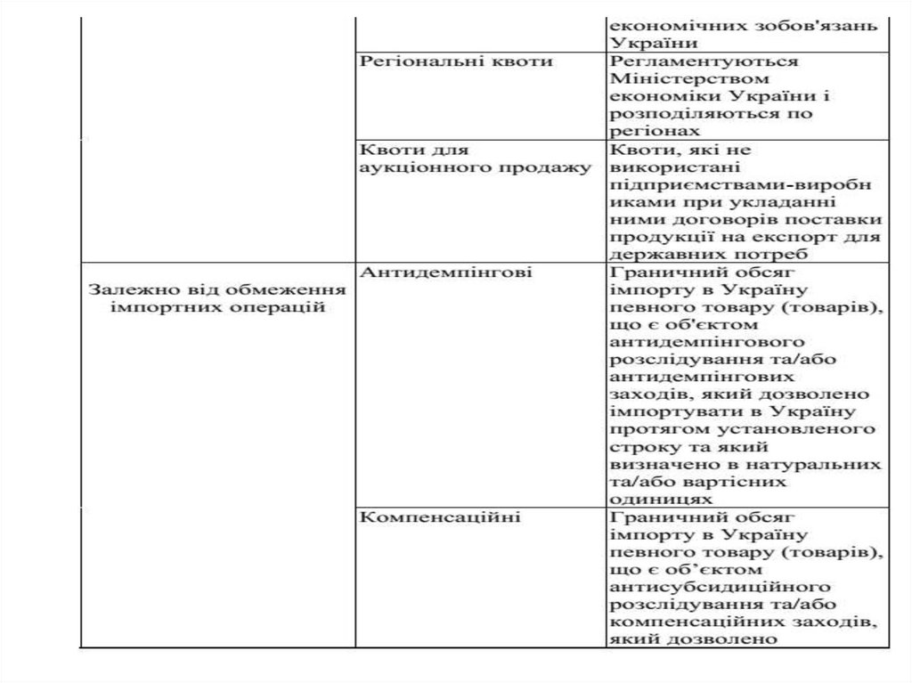 Квотування відноситься до кількісних або вартіснихобмежень експорту та імпорту товарів, яке