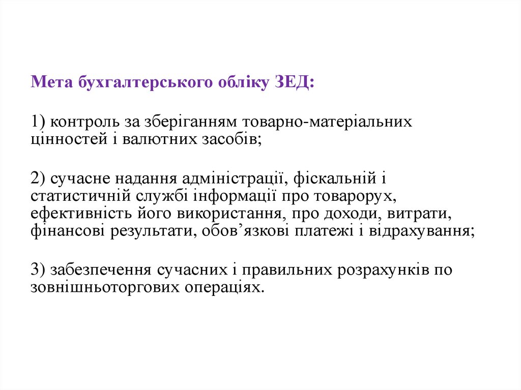 Мета бухгалтерського обліку ЗЕД:1) контроль за зберіганням товарно-матеріальних