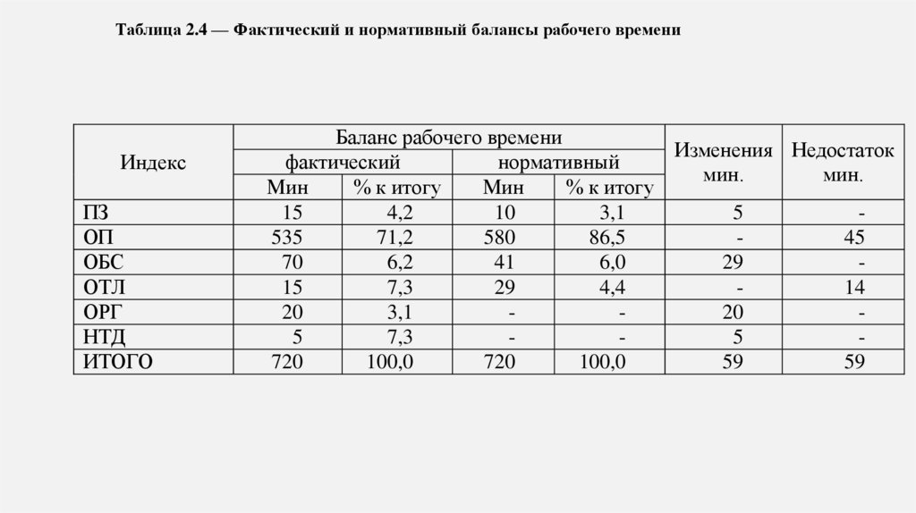 Таблица 2.4 — Фактический и нормативный балансы рабочего времениИндекс