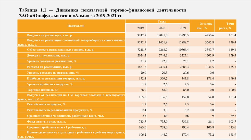 Таблица 1.1 — Динамика показателей торгово-финансовой деятельностиЗАО «Юнифуд» магазин «Алми» за 2019-2021 гг.