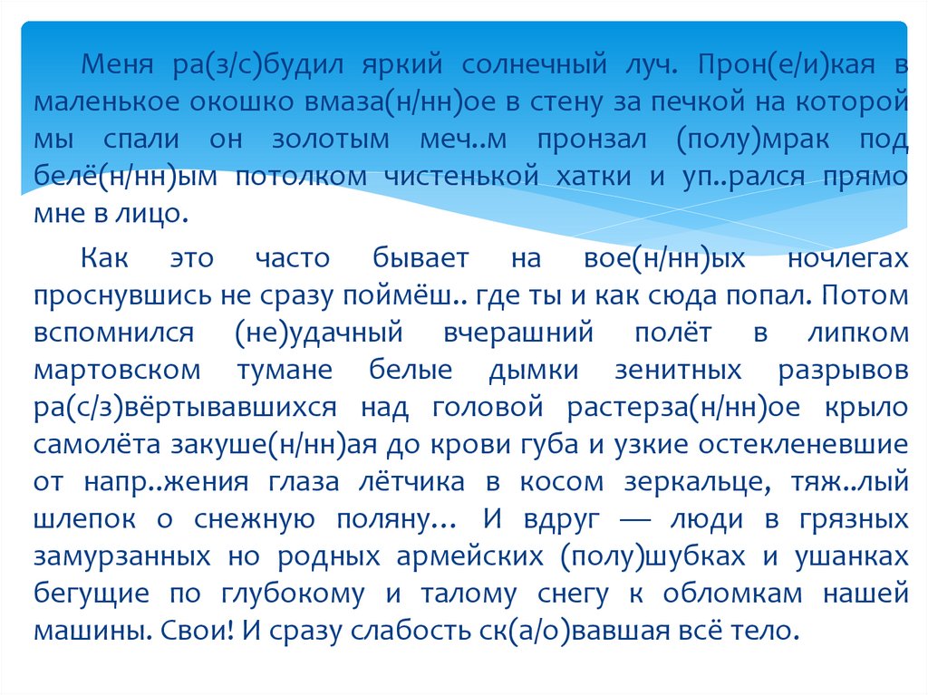 Меня ра(з/с)будил яркий солнечный луч. Прон(е/и)кая вмаленькое окошко вмаза(н/нн)ое в стену за печкой на которой
