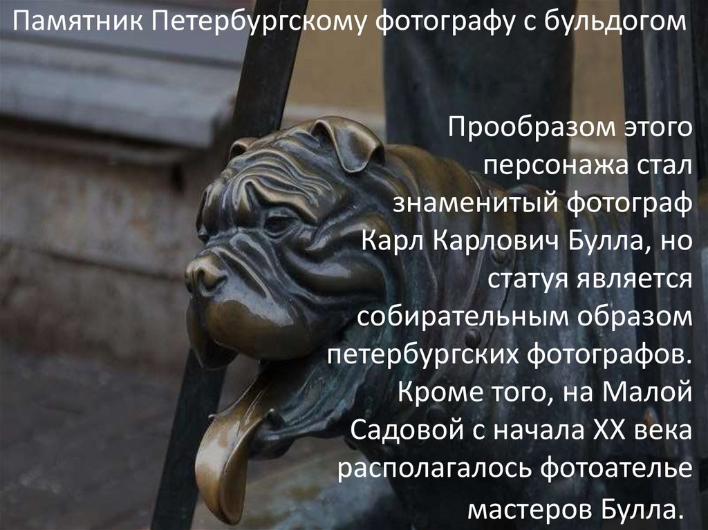 Памятник Петербургскому фотографу с бульдогомПрообразом этого