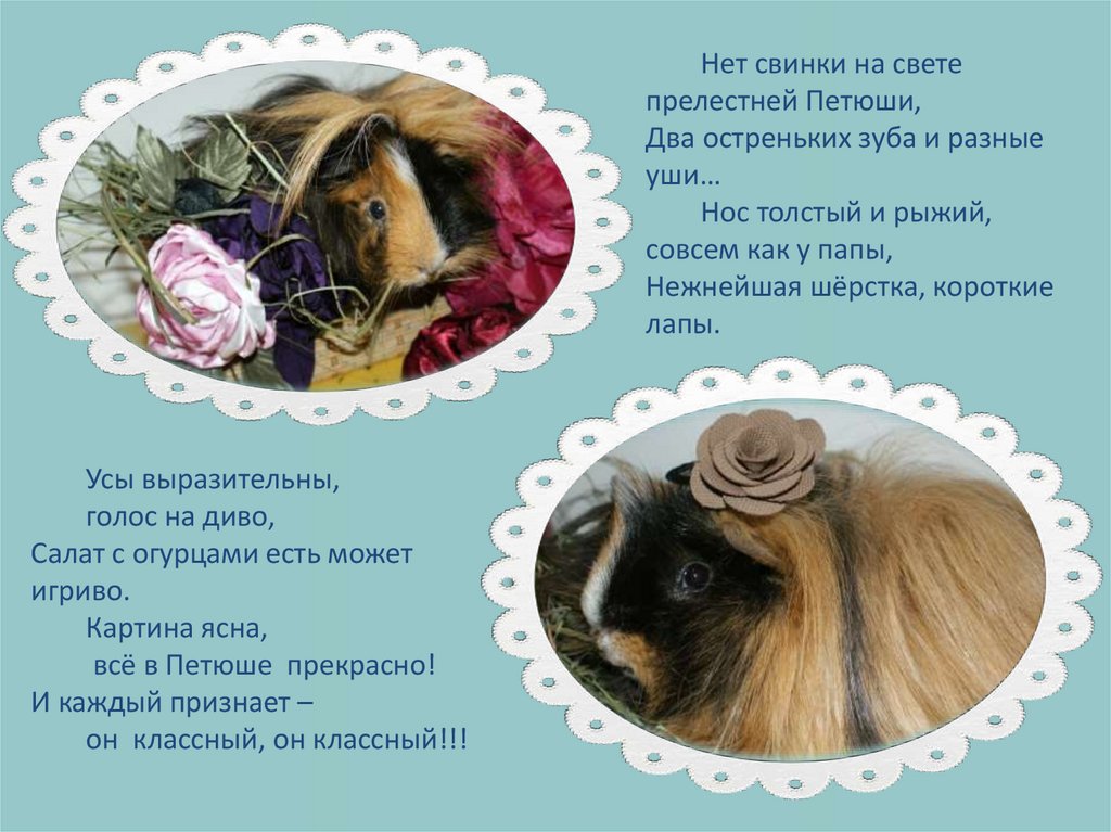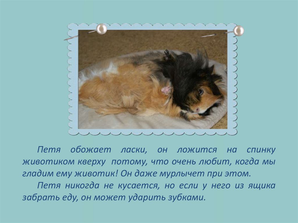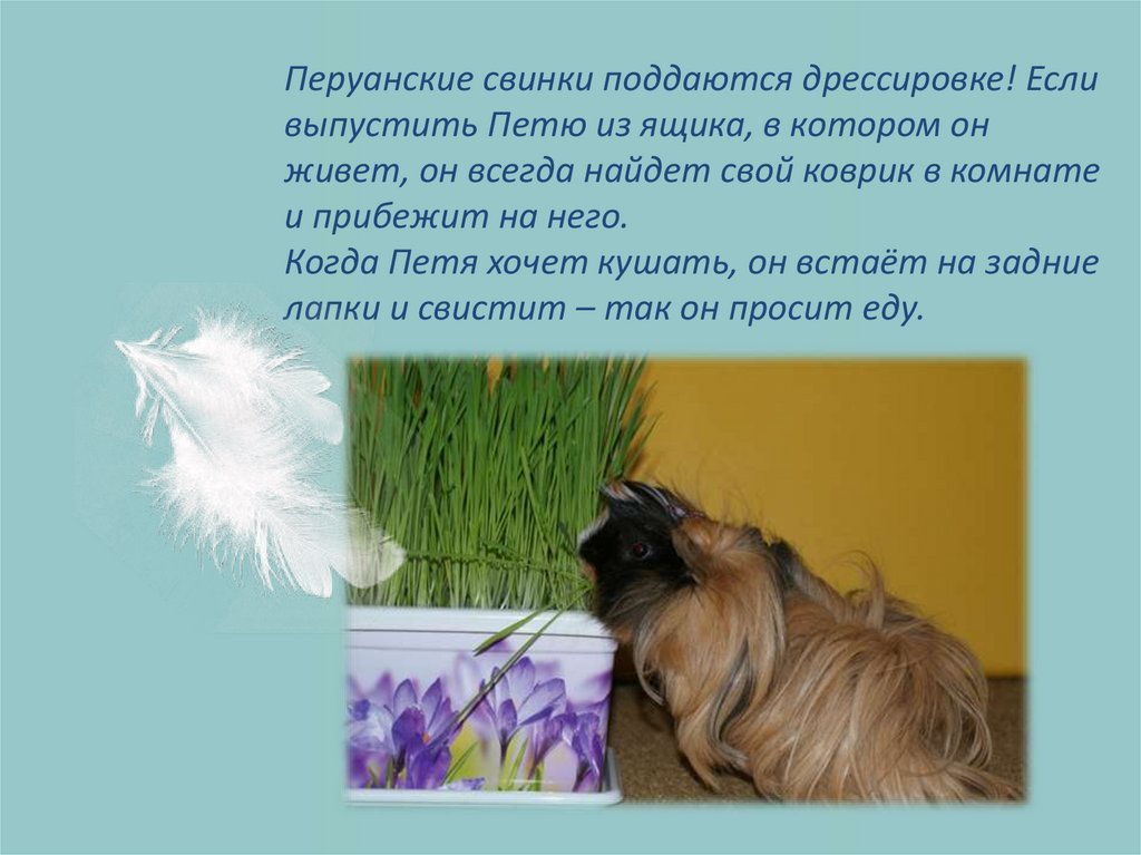 Существует около 20 пород морских свинок. Петя – перуанскаяморская свинка. У него очень длинная шерстка. У нас даже есть