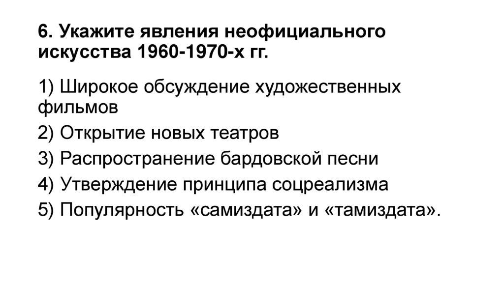 6. Укажите явления неофициальногоискусства 1960-1970-х гг.