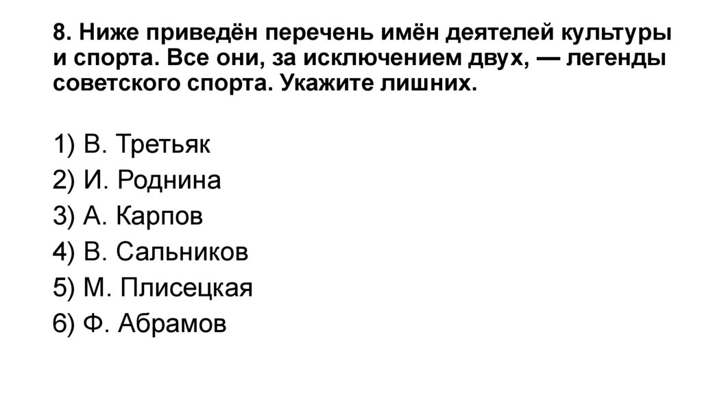 8. Ниже приведён перечень имён деятелей культурыи спорта. Все они, за исключением двух, — легенды