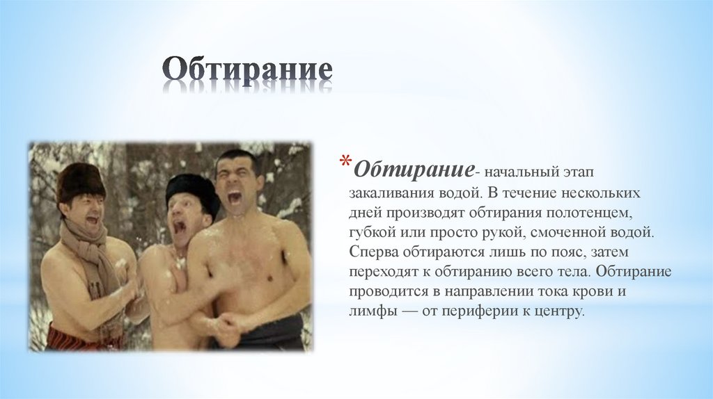 *Обтирание- начальный этапзакаливания водой. В течение нескольких