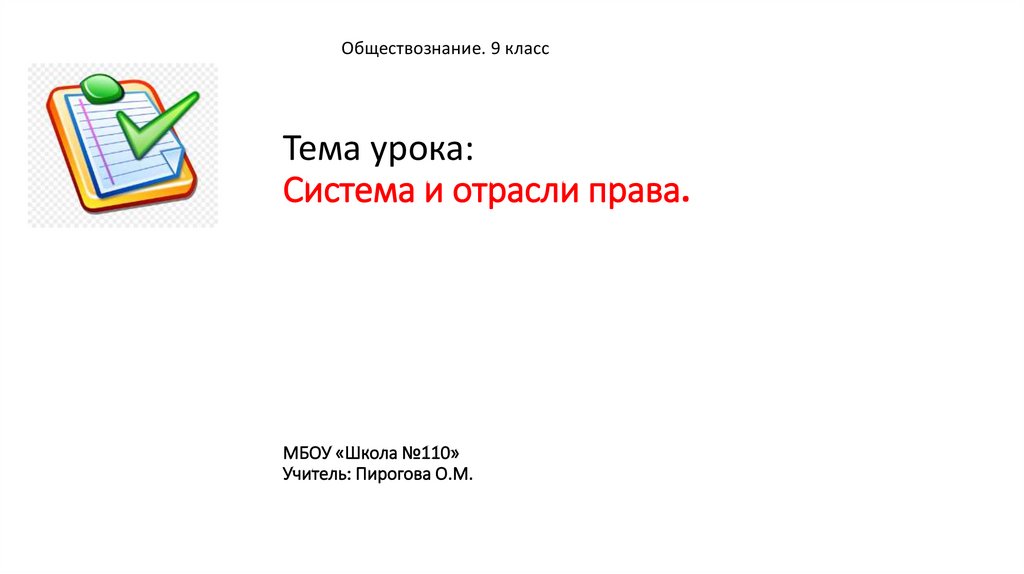 1. Тема урока: Система и отрасли права. МБОУ «Школа №110» Учитель: Пирогова О.М.