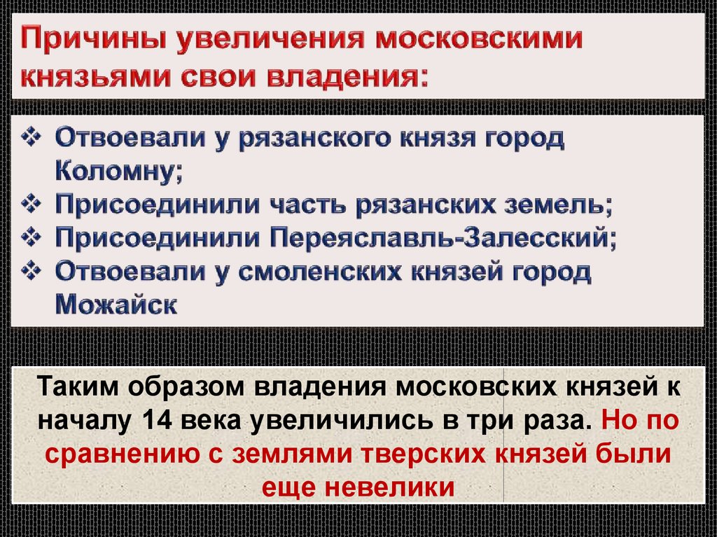 Таким образом владения московских князей кначалу 14 века увеличились в три раза. Но по