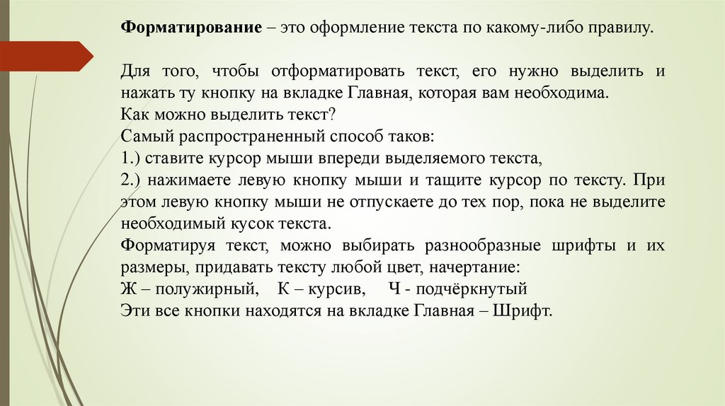 Форматирование – это оформление текста по какому-либо правилу.Для того, чтобы отформатировать текст, его нужно выделить и