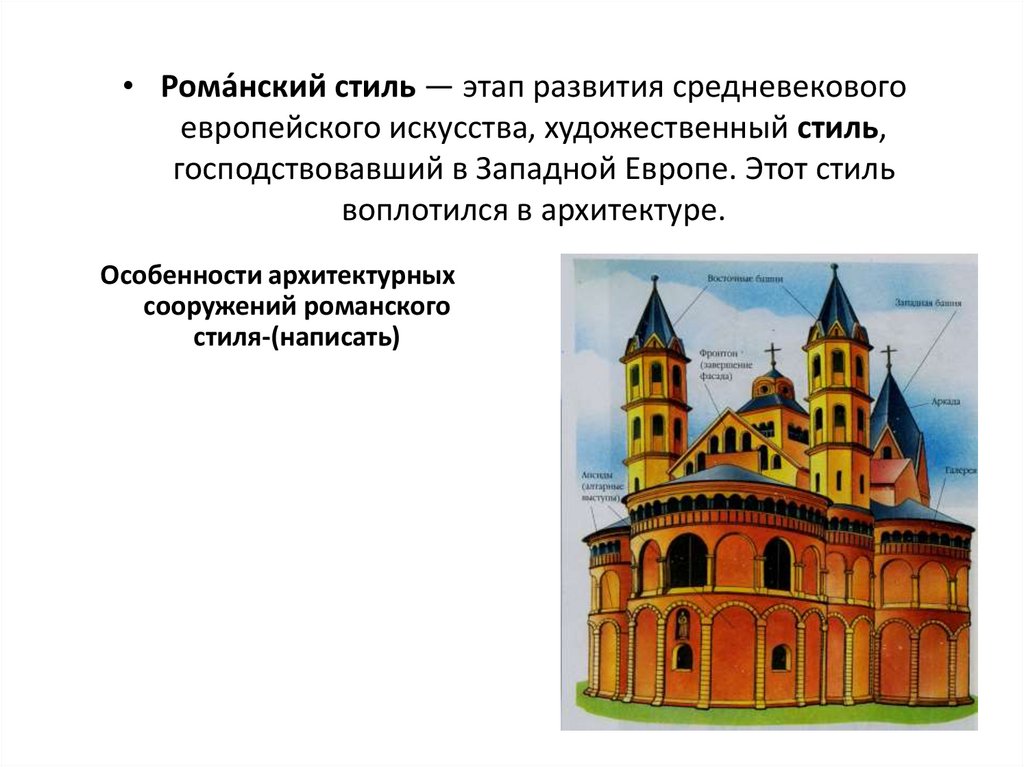 • Рома́нский стиль — этап развития средневековогоевропейского искусства, художественный стиль,