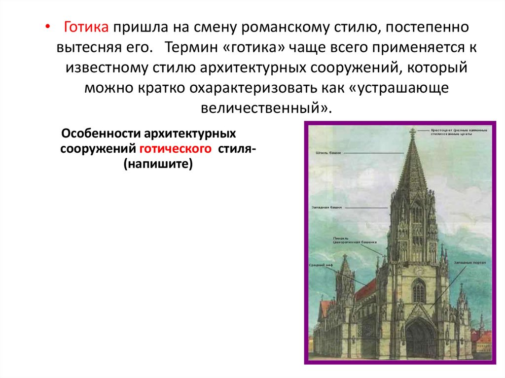 • Готика пришла на смену романскому стилю, постепенновытесняя его. Термин «готика» чаще всего применяется к