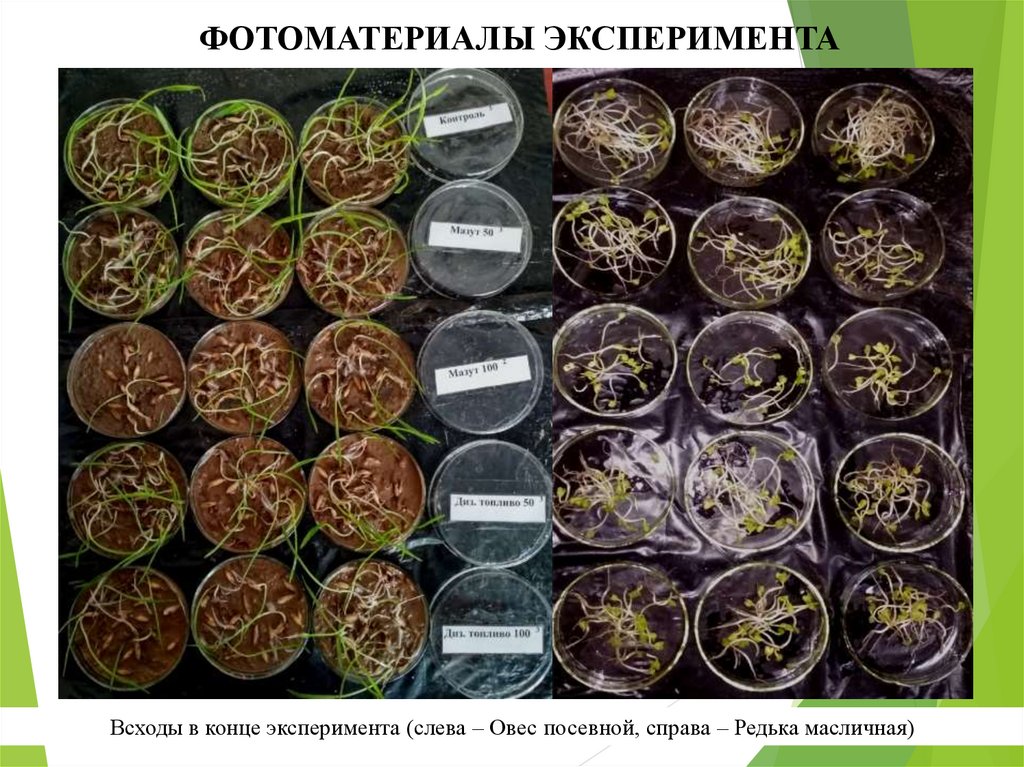 Всходы в конце эксперимента (слева – Овес посевной, справа – Редька масличная)