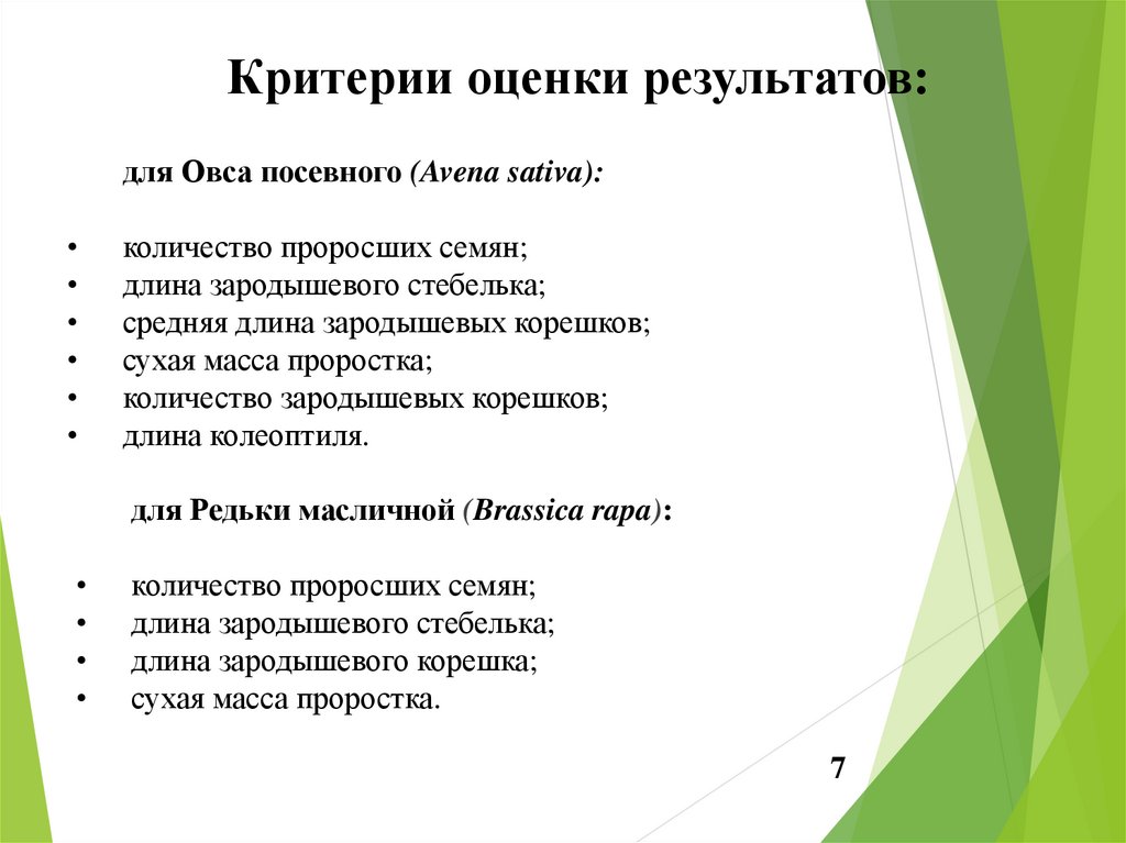 Критерии оценки результатов:для Овса посевного (Avena sativa):