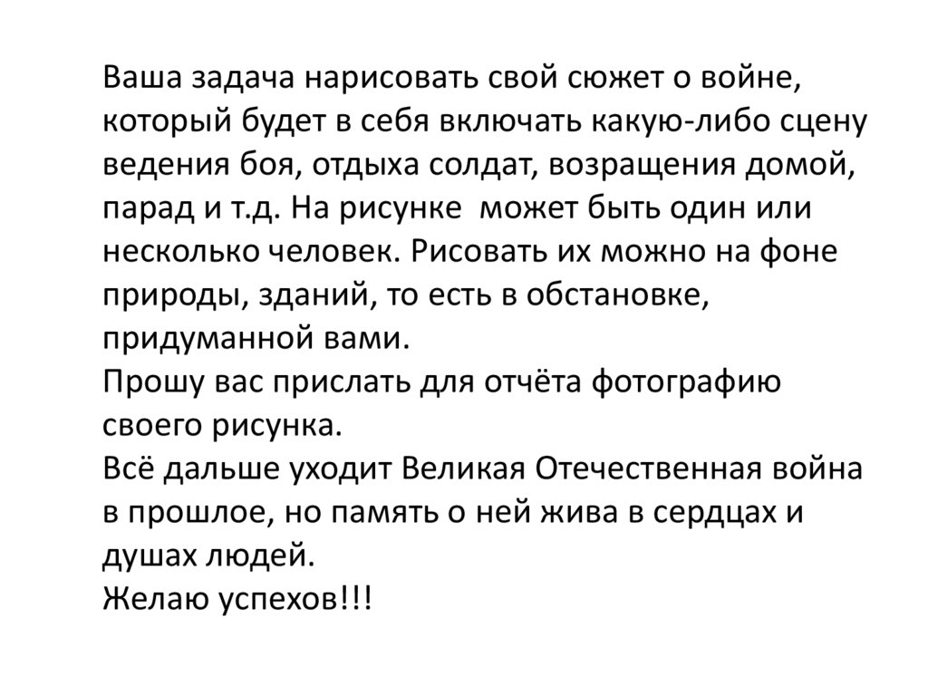 Ваша задача нарисовать свой сюжет о войне,который будет в себя включать какую-либо сцену